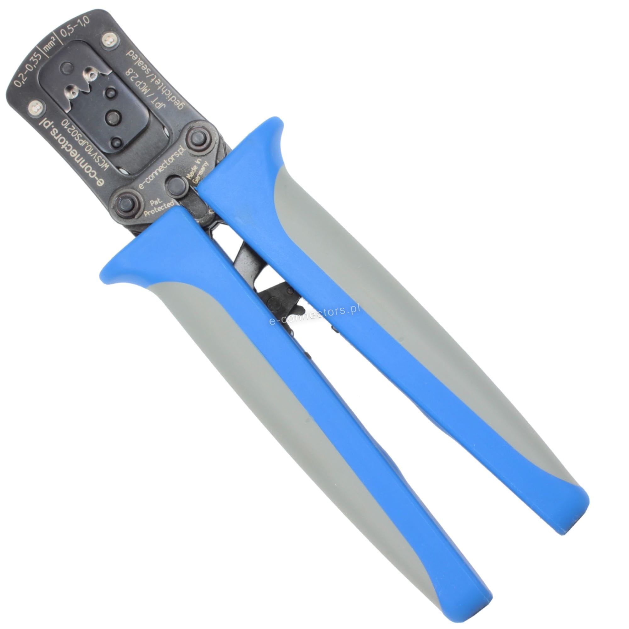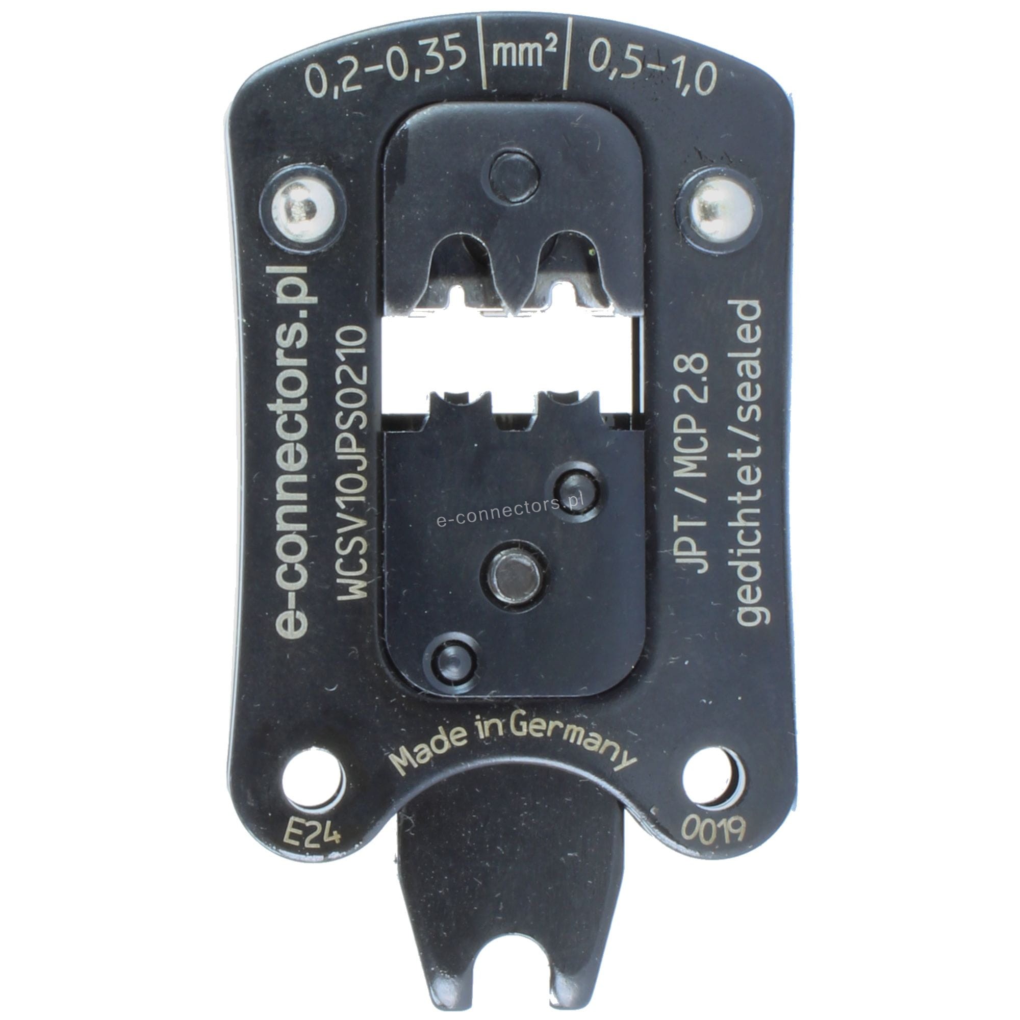Profesjonalna zaciskarka z wymiennymi szczękami dedykowana do konektorów JPT, MCP a także wielu innych typów konektorów. Zaciska konektor wraz z uszczelką na przewodzie w sposób przedstawiony na zdjęciach. Zakres zaciskanych konektorów od 0,2 do 1,0mm². Cechą która wyróżnia tę zaciskarkę z pośród wielu na rynku jest przede wszystkim idealne dopasowanie, niewielki rozmiar oraz praktyczne wymienne szczęki, za pomocą szybkozłącza. Połączenie uchwytu z matrycą pozwala wymienić szczęki zaciskarki w zaledwie 5 sekund, co okazuje się bardzo praktyczne jeśli zaciskamy wiele rodzajów konektorów. Dzięki przemyślanej konstrukcji siła jaką trzeba użyć aby poprawnie zacisnąć konektor jest mniejsza niż w większości tradycyjnych zaciskarek o większych gabarytach co również w przypadku dłuższej pracy może mieć znaczenie dla użytkownika. Zaciskarka od e-connectors to profesjonalne narzędzie przygotowane na zamówienie i w porozumieniu z niemiecką firmę Wezag. Odpowiednio dopasowana matryca to 100% satysfakcji.