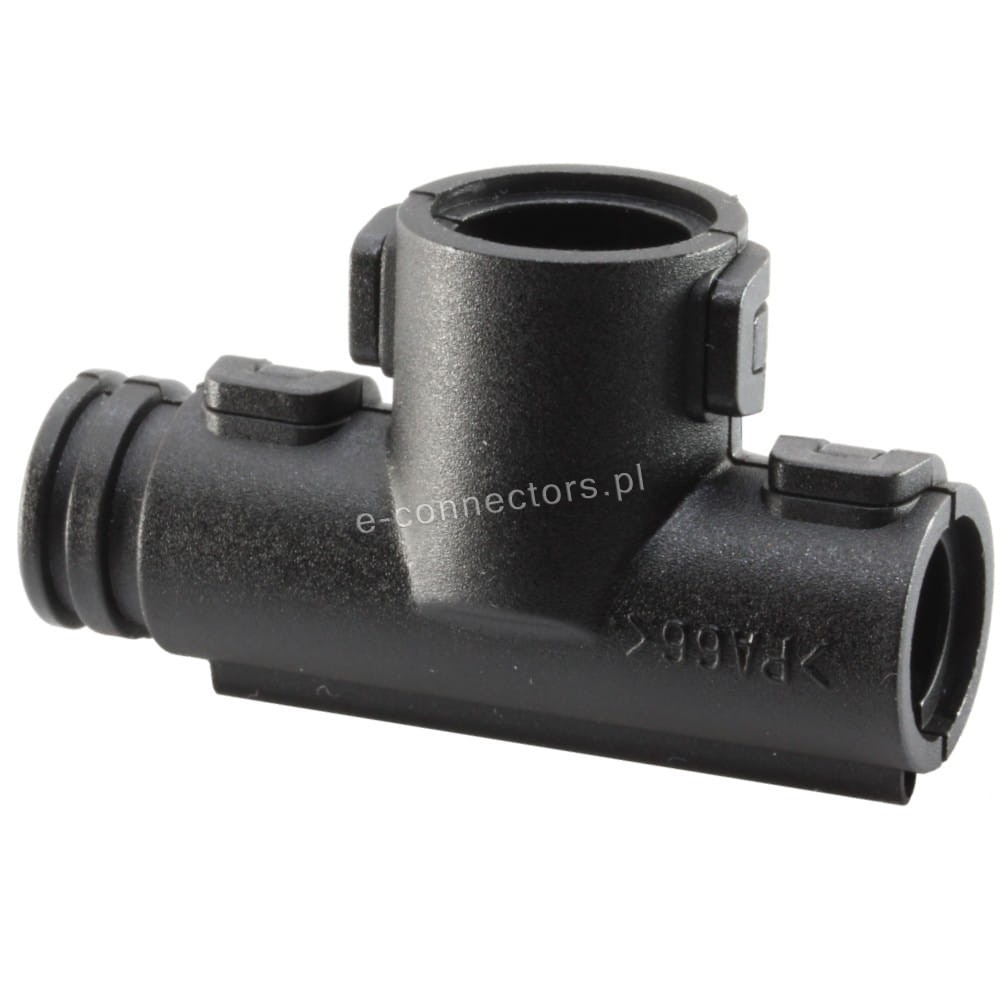 Oferta dotyczy 1 sztuki trójnika do rury karbowanej, peszla dla instalacji elektrycznych. Produkty Frankische to gwarancja najwyższej jakości. Trójniki jednoczęściowe, otwierane, typu T 90º, pozwalają na połączenie trzech rur karbowanych, peszli. Trójniki wykonane są ze specjalnie modyfikowanego poliamidu, który jest samo gasnący, wolny od halogenów i kadmu. Peszel mocujemy w trójniku przez zamknięcie złączki z samo zatrzaskiem na karbach rur, zapewniając wysoką wytrzymałość na wyrwanie rury ze złączki.