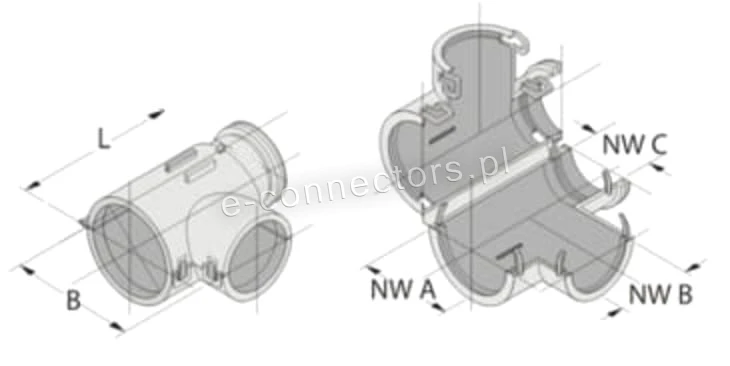 Oferta dotyczy 1 sztuki trójnika do rury karbowanej, peszla dla instalacji elektrycznych. Produkty Frankische to gwarancja najwyższej jakości. Trójniki jednoczęściowe, otwierane, typu T 90º, pozwalają na połączenie trzech rur karbowanych, peszli. Trójniki wykonane są ze specjalnie modyfikowanego poliamidu, który jest samo gasnący, wolny od halogenów i kadmu. Peszel mocujemy w trójniku przez zamknięcie złączki z samo zatrzaskiem na karbach rur, zapewniając wysoką wytrzymałość na wyrwanie rury ze złączki.