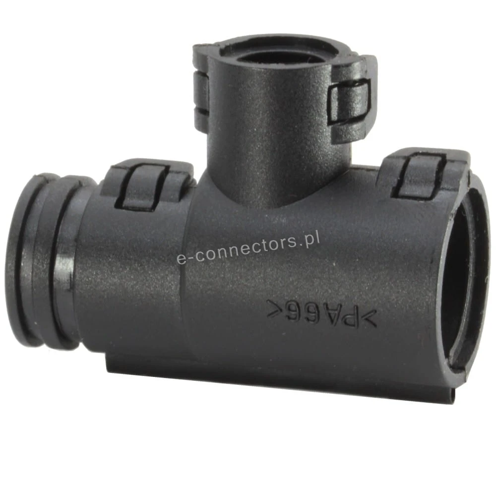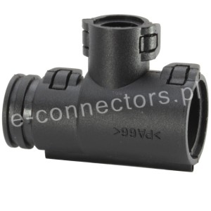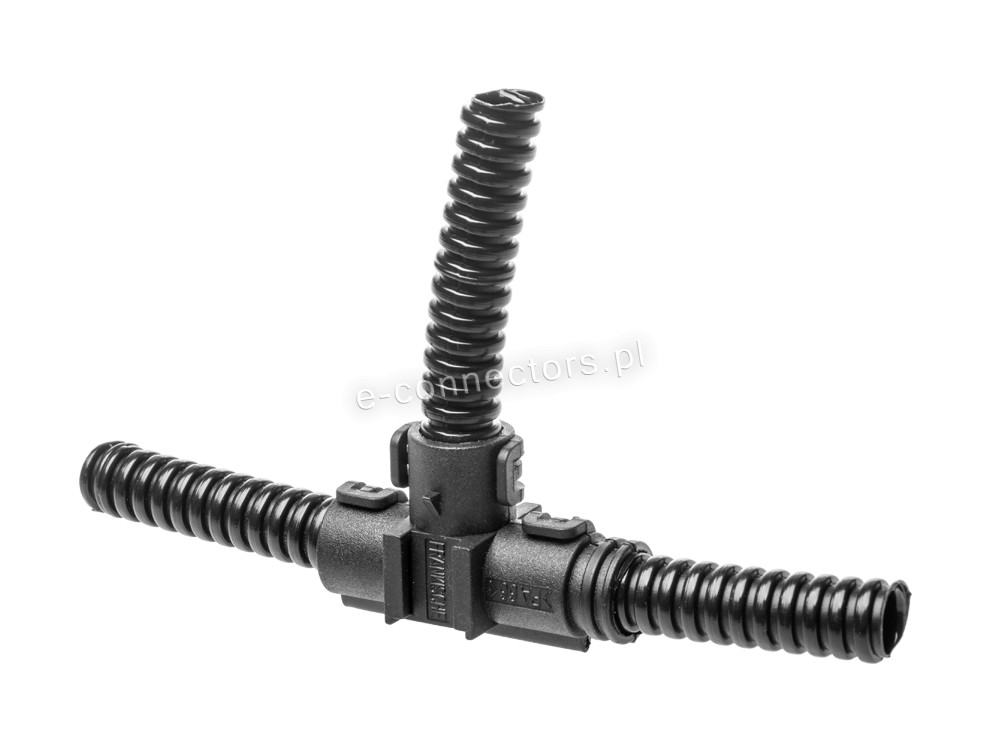 Oferta dotyczy 1 sztuki trójnika do rury karbowanej, peszla dla instalacji elektrycznych. Produkty Frankische to gwarancja najwyższej jakości. Trójniki jednoczęściowe, otwierane, typu T 90º, pozwalają na połączenie trzech rur karbowanych, peszli. Trójniki wykonane są ze specjalnie modyfikowanego poliamidu, który jest samo gasnący, wolny od halogenów i kadmu. Peszel mocujemy w trójniku przez zamknięcie złączki z samo zatrzaskiem na karbach rur, zapewniając wysoką wytrzymałość na wyrwanie rury ze złączki.
